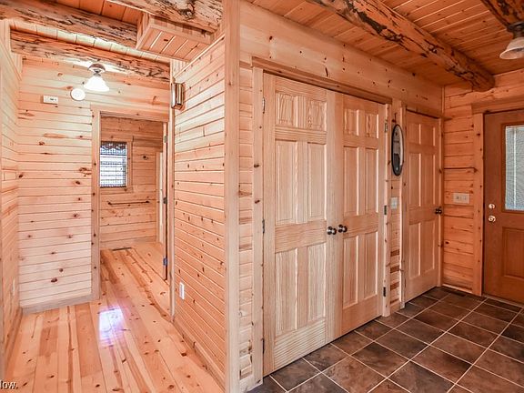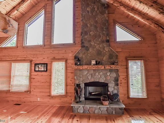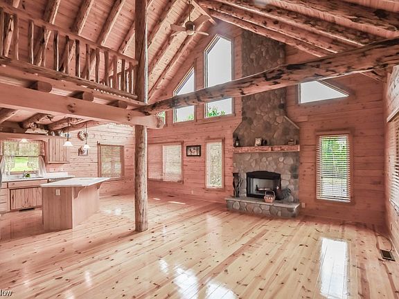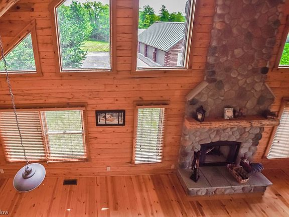 Escape to this rustic retreat on nearly 10 acres and surrounded by farmland. This gorgeous log home features a vaulted great room with a floor-to-ceiling gas fireplace and seamlessly connects to the eat-in kitchen, which boasts stainless steel appliances, hickory cabinetry, and a center island with breakfast bar seating. The main level hosts two spacious bedrooms with large closets and access to a full bath. A dedicated laundry room is a convenient bonus! Upstairs, you'll find a loft overlooking the great room plus a master bedroom with a walk-in closet and a three-piece bath. The walkout full basement is ready for your personal touch and is already plumbed for a full bath, offering potential for additional living space. Enjoy the expansive back deck that spans the length of the house, providing serene country views. For hobbyists and car enthusiasts, there are detached garages with space for four cars, as well as a shed for extra storage. The home also features Pella doors, Anderson w