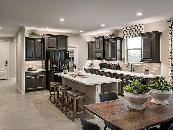 The stylish cabinetry in an expresso tone is complemented by upgraded quartz countertops. Great home with spacious sitting and socializing areas. The backyard features a built-in fireplace and landscape with artificial turf. Ask about builder incentives.
