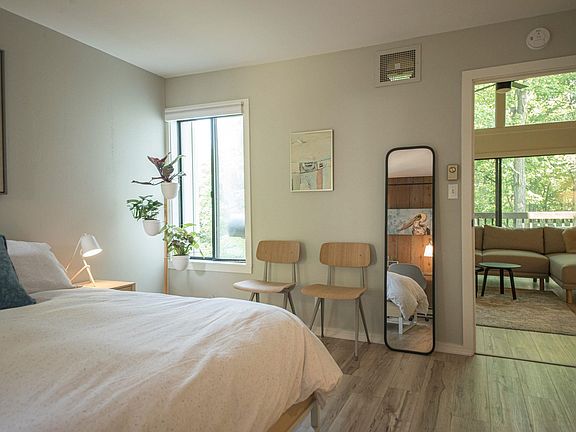 Scandinavian Modern Lodge in Leelanau County 15 minutes from downtown TC. Take advantage of this turn-key vacation home or use it as a full-time sanctuary. Stunning 2 BR, 2 bath upper floor condo features an open floor plan, gas f/p, vaulted ceilings & incredible views of woods & trails. Recently remodeled kitchen complete w/ new flooring, lighting, appliances, high-end cabinets & quartz countertops. New stackable w/d in main bd rm walk-in closet. Deep closets & an extra storage rm in the bsmt make condo living easy. Sun Perch owners have use of a pool, bike rm, bsmt conference rm/entertaining area, ample parking & boat storage. Pet welcome. Beach club is available on a wait list.