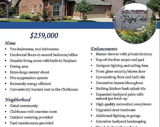 The home is approximately 1,600 square feet with two bedrooms and two bathrooms. There are hardwood floors in second bedroom/office and a sizable living room with a built-in fireplace. The dining area has a great view of the backyard. The extra-large master closet provides plenty of space for two people if needed. The house has a fire suppression system and is extremely energy efficient. If you are interested in activities you will enjoy the convenience of being located next to the clubhouse. Ridge Crest is a gated community with an exercise room in the clubhouse. Outdoor watering and yard maintenance are provided. Ridge Crest is a vibrant community with scheduled activities and sidewalks throughout. Here is a list of the many enhancements of the home. Master shower with private lavatory Top-of-the line carpet and pad Designer lighting and ceiling fans Front glass security/storm door Eye-catching floor and bath tile Decorative faucets throughout Striking kitchen back splash tile Expanded backyard patio with natural gas hook-up High quality convection oven/stove Upgraded door hardware Additional lighting in garage Extensive backyard landscaping Wood shutters throughout Expanded storage area in attic Additional window in living room Enlarged master closet with added lighting and electrical outlets Hide-Away ironing board in master closet