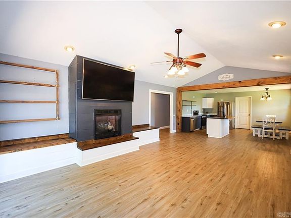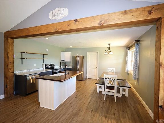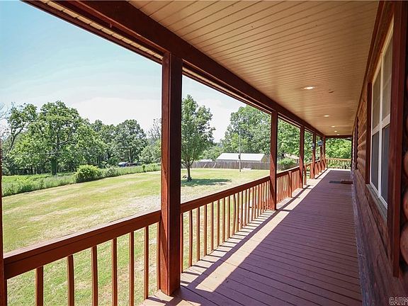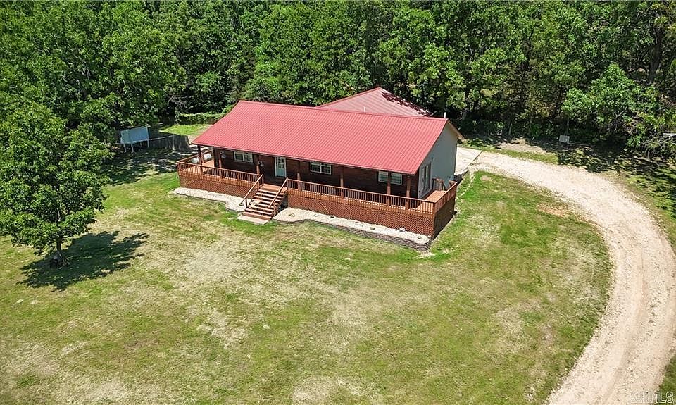 Rural, spacious, and practical. This updated 5-bedroom, 3-bathroom home offers over 2,300 sq ft of living space on 1 acre, minutes from Harrison. The open-concept design connects the living room with its cathedral ceilings and gas fireplace to the farmhouse-inspired eat-in kitchen, creating an inviting atmosphere for gathering or entertaining. The primary suite features a private bathroom, walk-in closet, cathedral ceilings, and a private exit onto the wraparound deck that adorns the front of the home. Notable attributes include a pull-through attached two-car garage, attached metal workshop area, metal roof, low maintenance vinyl and log siding, and a long private driveway with a gate, all in a desirable school district. This home combines the best of country living with modern efficiency.