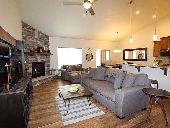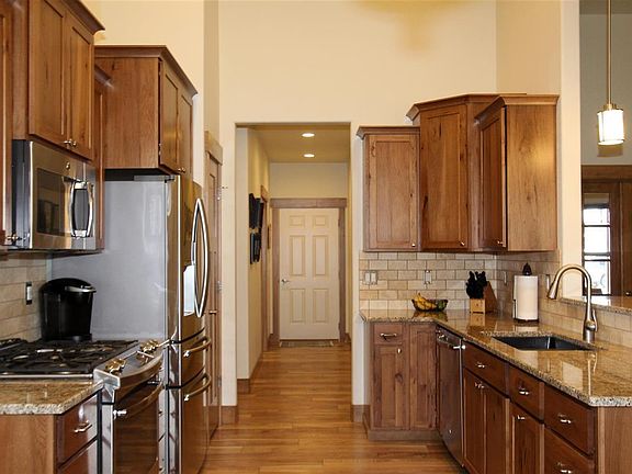 New energy efficient single level home Quality constructed 1900sf+/-, 3 bedrooms (Master Suite), Den with French doors, 2.5 bathrooms & a 3-car finished garage. Master suite with soaking tub, walk-in tile shower, granite counters & a spacious walk-in closet and back yard patio. Stunning from the inviting entry to the chef's kitchen with granite counters, SS appliances, tile back splash, hickory cabinets w/soft close doors & pantry. Open living room w/Rock accented floor to ceiling fireplace. Efficient forced air heat & Air Conditioning. Covered patios off the front of the house, living room & master bedroom. Fenced and landscaped yard with sod, sprinkler system, & finished garage (23/21 x 31) insulated, taped & painted. Lots of windows for more light. Over $20,000 in upgrades. Immaculate throughout, you will be delighted!