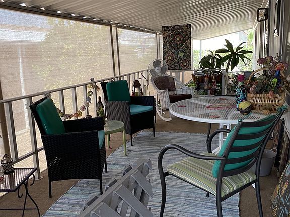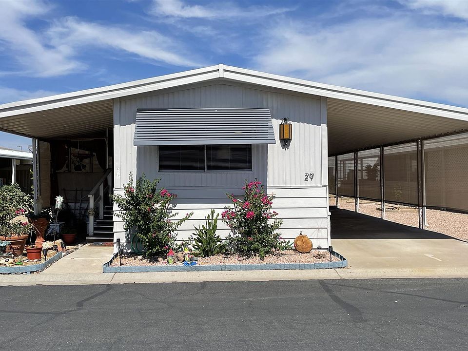 14 X 70 Cavco Catlina in quiet 55+ mobile home community. tastefully laid out; two master bedrooms, one at each end. Spa tub in one master bathroom with antique vanity & mirror. The home comes furnished. Owner will be removing art work and some personal property. Carport fits 2 cars (in tandem) and there is a large shed. Large deck with sunshades. The home is well-maintained and the lot is beautifully landscaped. Community has spacious clubhouse, fitness center, large swimming pool and hot tub. On-site management. RV storage available. Please call Casa Del Sol regarding fees and rules. Buyer must be approved by Casa Del Sol prior to submitting an offer. Info provided is the owner's best guess. Owner is a licensed real estate agent. Buyer to verify all facts and figure