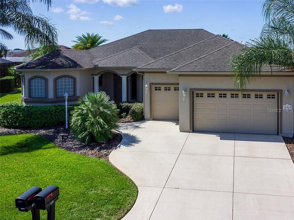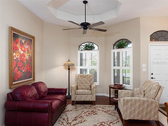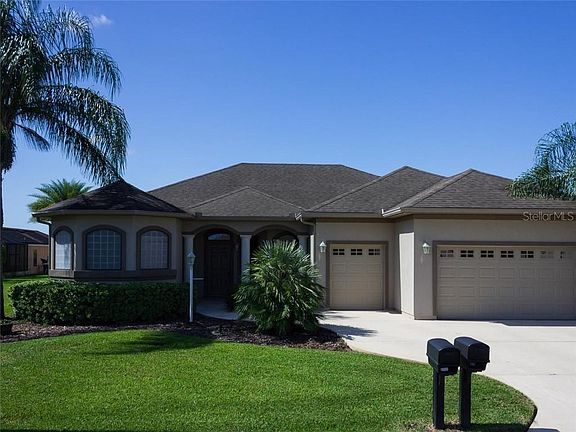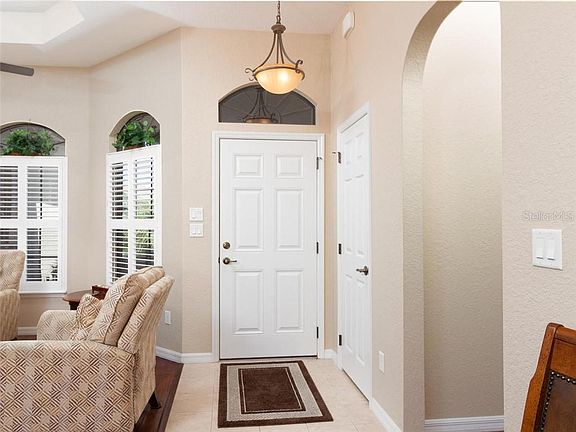 Welcome to your new home in Stonecrest, a 55+ gated, private, golf community in beautiful central Florida. 4 swimming pools, one indoors, over 90 clubs to join, and all golf cart accessible within and outside the community. This home has all the features that you will be delighted with and for now it is the only existing Spruce model on the market in Stonecrest. This three bedroom, 2 full bath, split floor plan home offers a new 2019 HVAC unit, an extended outdoor living space (23.5 x 34.8) with a screen enclosure and is partially covered to meet all your outdoor entertaining needs. Note the electric sun setter for added shade on the south facing SCREENED lanai. Welcome your family and guests to your new home by a covered front entry with columns, a foyer with columns, and an open living room and dining area with a tray ceiling. The kitchen is NICELY APPROPRIATED SPACE with a nook, a large island, breakfast bar, pullouts in the lower cabinets, newer stainless steel appl., a walk in pantry and a composite single bowl sink. There is an additional family room IN THIS MODEL which is very spacious and open to the kitchen. PLENTY OF SPACE FOR ALL WITH 3 bedrooms and a laundry room with front load washer and dryer to complete your laundry needs. This home is located in a great area of North Valley ll neighborhood with a two car garage plus a GOLF CART GARAGE complete with electric roll up screens , convenient for when you want to leave the garage doors open to have open air. The windows are accented by plantation shutters in the dining room and living room, also by very nice hand scraped engineered hardwood floors, as well as ceramic tile floors and (carpet only in the bedrooms). The master bathroom offers a soaking tub, a roman shower, dbl. bowl vanity, a water closet with a linen closet. All bedrooms have ceiling fans and closets, lever handles throughout, 60 gal. hot water heater and whole house reverse osmosis system. Nicely landscaped, termite bond in place until 06/2021 and a home warranty (BROWARD FACTORY) for one yr. from the date of purchase. This home is ready for you. Approximately 1.5 hours to coasts and airports. Close to hospitals, shopping, medical facilities and The Villages. This is it!! A great golf community for active adults.