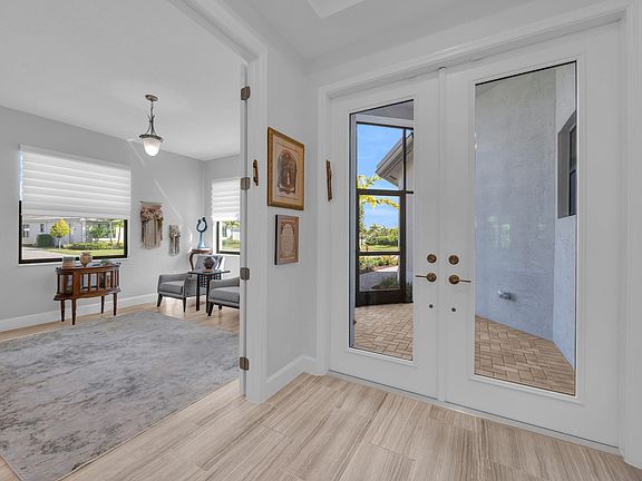 Discover this beautifully upgraded 3-bedroom w/ an office, 2.5-bath Palazzo model, offering 2,102 sq ft of refined living space and an enviable golf cart garage. Located on an oversized, landscaped corner lot, this residence seamlessly blends style, comfort, and function. Step inside to find freshly painted interiors and elegant 8'' x 24'' tile flooring throughout. The spacious great room is filled with natural light and features motorized blinds in both the dining and living areas. The gourmet kitchen impresses with quartz countertops, 42'' cabinets with crown molding, gas range, built-in pantry cabinet, pull-out trash drawer, designer backsplash, and a large island, perfect for entertaining. The serene primary suite showcases a tray ceiling, mirrored closet doors, and a spa-inspired bat with white quartz counters, built-in linen storage, floor-to-ceiling tile, decorative Listello, upgraded shower door, comfort-height toilets, and a pocketed water closet. Two guest bedrooms and a stylish full bath (also with comfort-height toilet and tile to ceiling tub/shower combo) provide ample space, while the flexible den/office easily converts into a 4th bedroom if needed. A convenient half bath adds to the thoughtful floor plan.