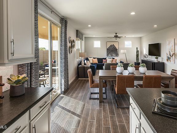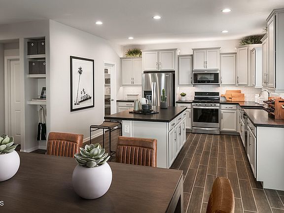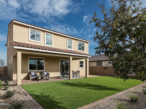 New Home Builder Model Home. Two-story Watson floorplan with Spanish style exterior. The first floor features a flex room that can serve as a home office, game room or sitting area. The second floor features a loft, the owner's suite and two additional bedrooms. The spacious kitchen features stainless steel appliances with gas range and an island with ample sitting space. The stylish cabinetry in a creamy white tone is complemented by upgraded granite countertops and wood color plank tile. Great home with spacious sitting and socializing areas. The backyard features an extended covered patio and landscape with artificial turn. Ask about Builders Incentives.