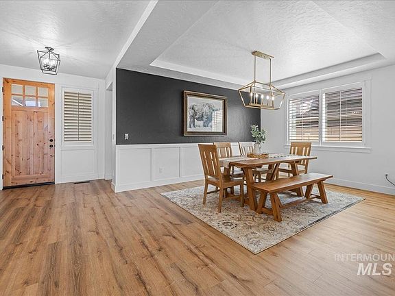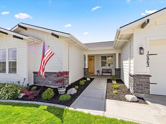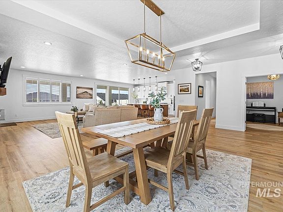 Located along the foothills of Star, this stunning single level home offers a perfect blend of comfort, luxury, and convenience. Built in 2022, this property is set above the neighboring homes below, offering privacy on a spacious 10,149 sq ft lot with a gas fire-pit, hot tub and a covered patio that spans the entire length of the home with a multi slide door which leads out to the patio to host guests and enjoy the summer! With ample living areas, modern finishes, and an abundance of natural light, this gorgeous home boasts an open-concept layout seamlessly connecting the gourmet kitchen, dining area, and living room, ideal for entertaining. The kitchen has quartz countertops with a large center island, walk-in-pantry, farmhouse sink, a wine fridge. The living room has a stacked stone fireplace and mantle, flanked by floating shelves. Enjoy a multi slide door out to the patio. With multiple bedrooms and bathrooms, this residence provides ample space for everyone to unwind.