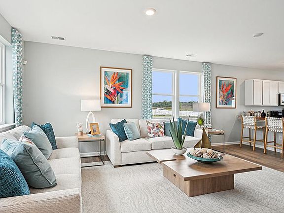 Explore a new home with backyard pond views at 10965 Farmerfield Street in Milford, DE, located in the welcoming Simpsons Crossing community. This two-story interior Jefferson townhome offers an open-concept floor plan with three bedrooms, two and a half bathrooms, and a rear-entry driveway. The first floor is spacious with a large, thoughtfully designed kitchen with stylish gray cabinets, stainless steel appliances, a storage closet, and a peninsula island featuring granite countertops with space for seating. The kitchen is open to the living and dining area providing your ideal space to entertain. The first floor also offers a powder room. The second floor has three large bedrooms, each with plenty of closet space, a hall bathroom, a linen closet, and a laundry closet with a washer and dryer included. The owner’s suite offers privacy away from the other bedrooms and features a full bathroom and a walk-in closet. The included white blinds and an innovative Smart Home® package will give you complete peace of mind. Pictures, artist renderings, photographs, colors, features, and sizes are for illustration purposes only and will vary from the homes as built. Image representative of plan only and may vary as built. Images are of model home and include custom design features that may not be available in other homes. Furnishings and decorative items not included with home purchase.