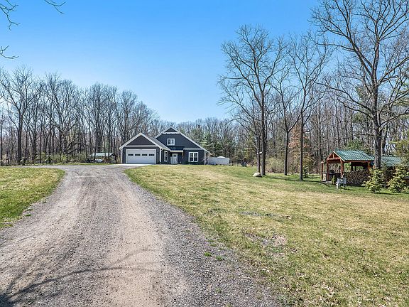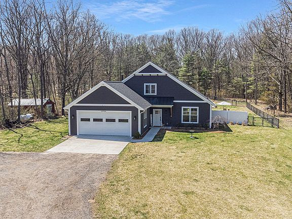 Fantastic two-year new home on 5 wooded acres just waiting to be yours. Just move in with no updating needed. Enjoy the included hot tub or set in the 3-season porch while enjoying the outdoor scenery, abundant birds and other wildlife. The rear yard is fenced in. Open main floor plan kitchen and living area with luxury vinyl plank floors. The kitchen has quartz counter tops & island with sink. Additionally, the main floor has 2 bedrooms, one with walk-in closet and ensuite bath, laundry room, and a half bath. The large primary bedroom suite is located on the 2nd level. The primary suite has his & her walk-in closets, an office area and full bath with walk-in shower. The property is great for hunting and is surrounded on 3 sides by the Flat River State Game area. All door locks, MyQ garage door opener and thermostat can be controlled from your phone from anywhere. Home is also plumbed for in-floor radiant heat but is not connected for use. Fiberoptic internet. One outbuilding is actually a small log type cabin with finished interior and a built-in grill on the patio area of the cabin. Schedule your personal showing today to make this great property yours.