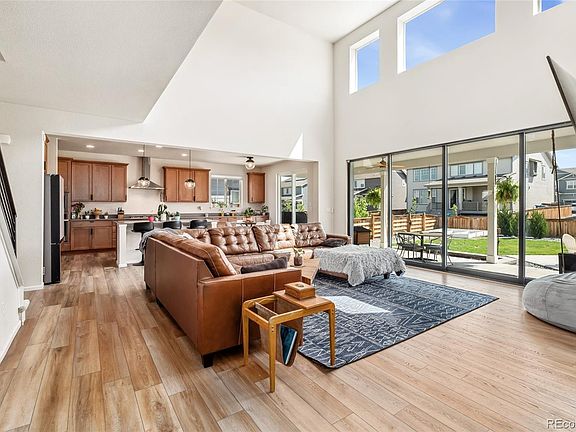 Step into this stunning two-story home in the gated community of Gallery at Reunion, where elevated design and modern details come together. The upgraded exterior elevation and remarkable curb appeal set the stage for a grand open-concept living space filled with natural light. Soaring ceilings in the family room feature a dramatic glass wall opening to a beautifully landscaped backyard with a large covered patio, fire pit seating area, and raised garden beds for seamless indoor-outdoor living. Inside, sophisticated touches like sleek iron railings, black fixtures and door hardware, upgraded lighting, and modern flooring create a stylish ambiance. The oversized gourmet kitchen shines with quartz countertops, a grand center island, a walk-in pantry, stainless steel appliances including a gas cooktop and range hood, and a dedicated eat-in area. A butler’s pantry connects to the oversized formal dining room, ideal for hosting gatherings. The main-floor office with French doors offers a private workspace, while a half bath and laundry room with sink add convenience. Upstairs, the private primary suite is a luxurious retreat with dual sinks, an oversized step-in shower with double shower heads, and a spacious walk-in closet. Three additional bedrooms include one with an ensuite bath and walk-in closet, while the others share a full bath with dual sinks. A charming loft nook provides space for a desk or reading area. The expansive finished basement offers an oversized recreation room, a conforming bedroom, a bathroom, and a versatile bonus room for a home gym or creative space. Additional highlights include a three-car attached garage, covered front porch, and a sense of community throughout the well-maintained grounds. Residents enjoy resort-style living with parks, pools, a rec center with a fitness facility, walking and biking trails, and proximity to Buffalo Run Golf Course, along with easy access to E-470, I-76, popular schools, shopping, dining, and more.