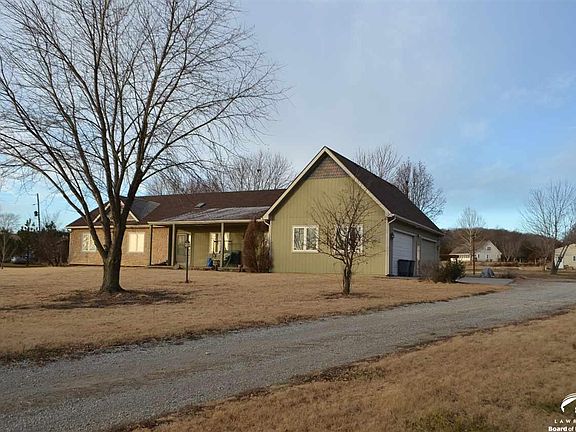 Gracious executive rancher on 3 Acres with wood heat and lots of potential after the 2019 tornado. Water intrusion and sheet rock removal provides opportunity for DIY folks to finish basement! Kitchen opens to great room with wood stove hearth and tall rock chimney. Formal dining room, 3 bedrooms, full bath and master full bath. 4-car attached garage plus outside parking area. Deck, flower garden & Koi pond. Concrete floor in garden shed & shop with electricity. Hard surface roads. Creek on north lot line.