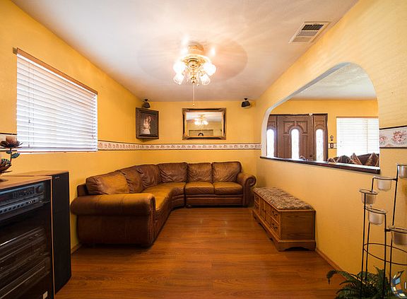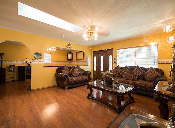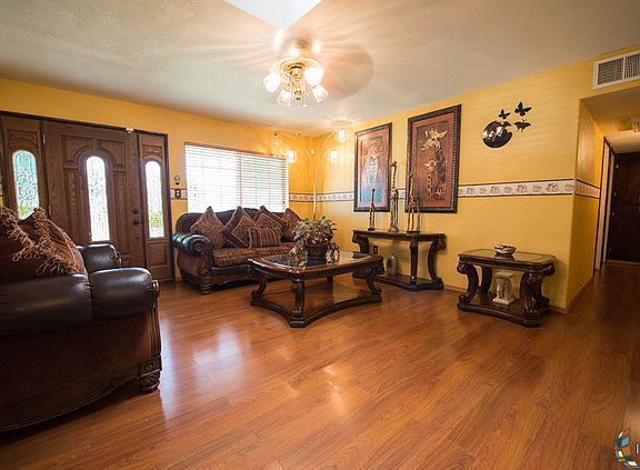 Beautifully remodeled home! This home sits on a HUGE corner lot with a stunning backyard landscaped with lot of grass, lemon trees, oranges, pomegranates, limes, grapefruit, and more all on automatic sprinklers and irrigation. This home has been through many recent updates to make it extremely energy efficient including the replacement of all the windows to double paned windows, added R-30 insulation in the attic, a 4 year old Goodman A/C system, and an added extra layer of stucco for even more insulation. The kitchen was fully remodeled with new custom handmade cabinets made specifically for this kitchen. The tile mosaic backsplash compliments the stainless steel appliances. Other great features include tile and cherry laminate wood flooring throughout, a front door with side panels and windows, living room wired for surround sound, ceiling fans and window blinds throughout, huge 2 car carport, and a natural wood with water sealant covered patio with colored pavers and ceiling fan.