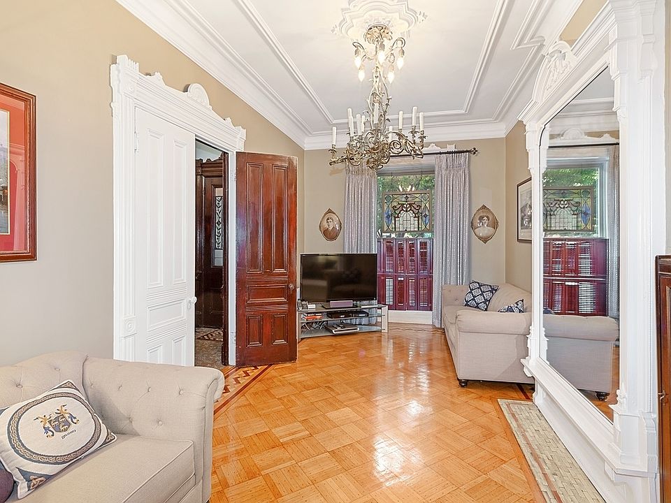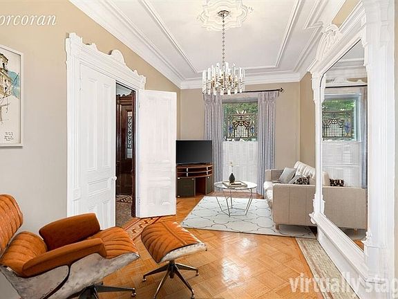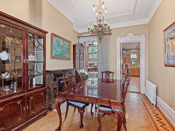 One of a row of six brick neo-Grec houses built in 1884, 1097 Lorimer Street is the perfect combination of old-world charm meets modern conveniences. Lovingly renovated and maintained by the same family for more than 50 years, this home is move-in ready for its next owner to make history. Enter through the solid mahogany double entrance doors to the parlor level's living and dining rooms with 10'10" ceilings, classic inlay floors, gorgeous dining room mantel and original chandeliers. The rear L houses an extra large kitchen with a stainless steel Wolf professional range and hood, dishwasher, refrigerator and full-load washer/dryer closet. There is an L-shaped deck off the kitchen which makes indoor/outdoor entertaining seamless.The clever owners even tucked a bright, bead board powder room on this level that feels as though it is original! Enjoy the colorful skylight as you ascend the stairs to the second floor where there are two bedrooms, a home office, a walk-in closet and spa-like bathroom. The garden-level, in-law apartment has its own entrance under the stoop leading to a hallway of incredible storage closets, a bedroom, den, bathroom and eat-in kitchen - there is a bonus storage shed leading to the rear patio. 1097 Lorimer Street is a rare opportunity to own a turn-key property in Greenpoint's Historic District.