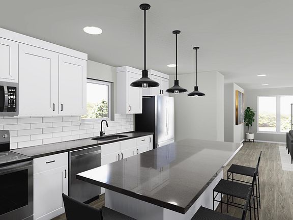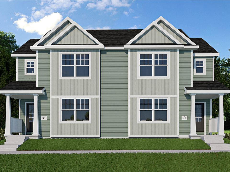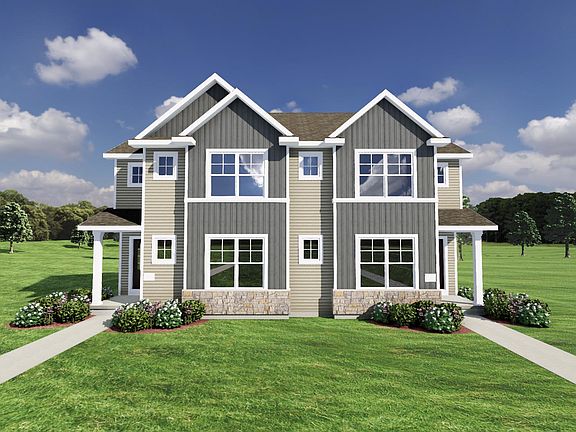 Image is representative of home; colors may vary.All prices, promotions and specifications are subject to change at any time without notice based on the discretion of Veridian Homes. Amenities: 12'x14' Patio with picture framing, Basement features 3/4 bath rough-in for future finished basement, Convenient main floor laundry, Cottage style twin home, with 3 bedrooms and 2 1/2 bathrooms, Custom Auburn Ridge(R) cabinetry, doors and trim throughout the home, Exterior features Mastic(R) siding in "Quiet Willow," Mastic(R) Board & Batten in "Scottish Thistle" and Pella(R) Encompass Windows in White, Hallman Lindsay(R) "Place of Dust " paint with Orange Peel Texture, Kitchen features large island with a breakfast bar and Daltile One(R) quartz countertops in "Woven Wool", Open Concept floor plan, Owner's suite features tray ceiling, walk-in closet, plus owner's bath, Shaker-style kitchen cabinetry in "Silhouette on Maple" includes hardware, crown moulding, soft close drawers/doors, and pull-out trash, Top plumbing brands used throughout the kitchen and bath, such as Kohler, Sterling and Moen, Trends(R) Monarch LVP flooring in "Summer Storm" throughout kitchen, dinette, foyer, powder room, laundry and great room