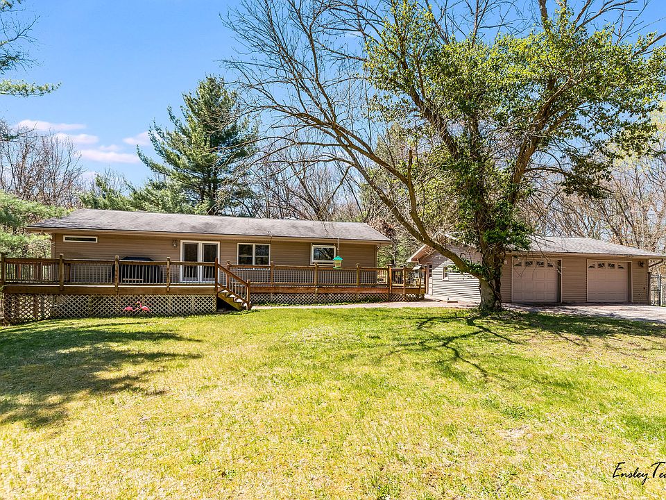 Beautiful walk out Ranch located on almost 2 serene acres in Greenville Public Schools. Large entry with storage closets welcomes you upon walking in. High quality kitchen includes cherry soft close custom cabinets, granite countertops, ceramic backsplash and flooring, and huge island/bar with 2nd wash sink. Large dining room with sliders leads out to the wrap around deck. Open concept living room with picture window. Beautiful wood flooring throughout. Master suite has private deck with large his/her walk in closets, a jet tub, and heated ceramic floors. Main floor laundry and guest half bath add convenience. The basement is where you'll find a ginormous living room with pellet stove fireplace, huge bathroom, tons of storage, another hookup for washer/dryer, and the second large bedroom with sliders. The property is abundant with wildlife, a dog run, a 3 sided 36x 20 pole barn. 2 stall detached oversized garage has a wood stove and built in work benches.