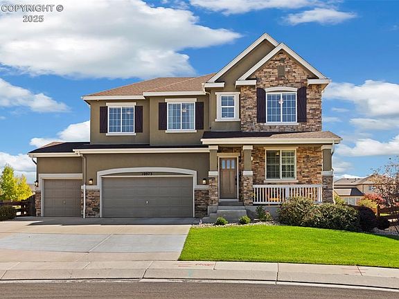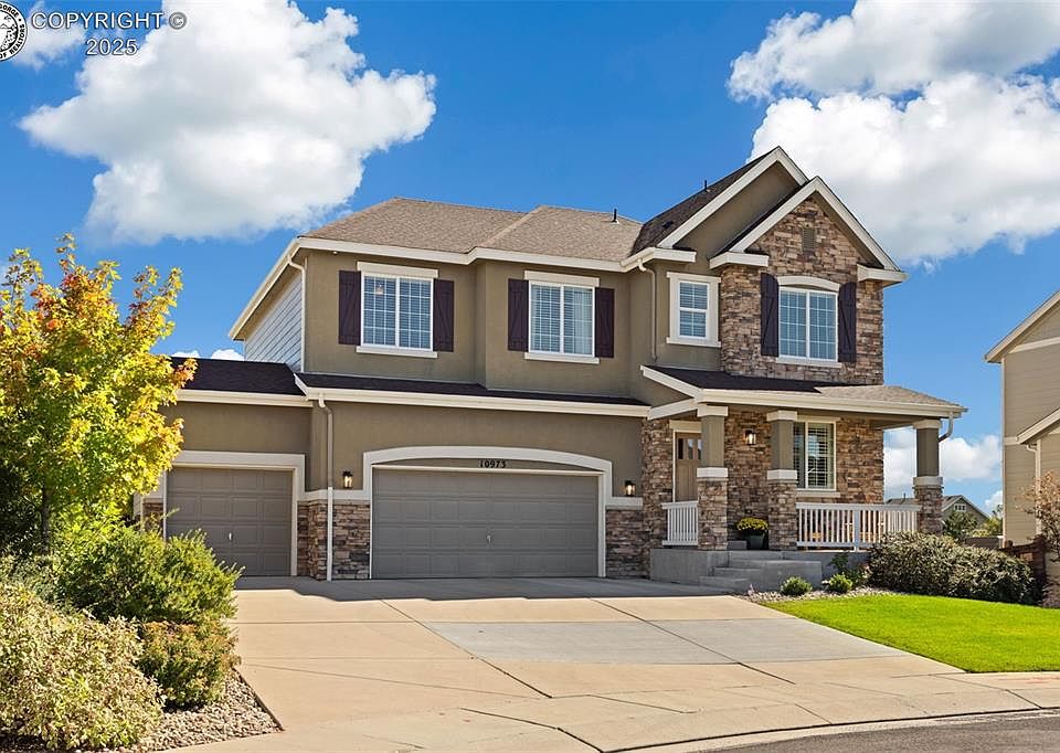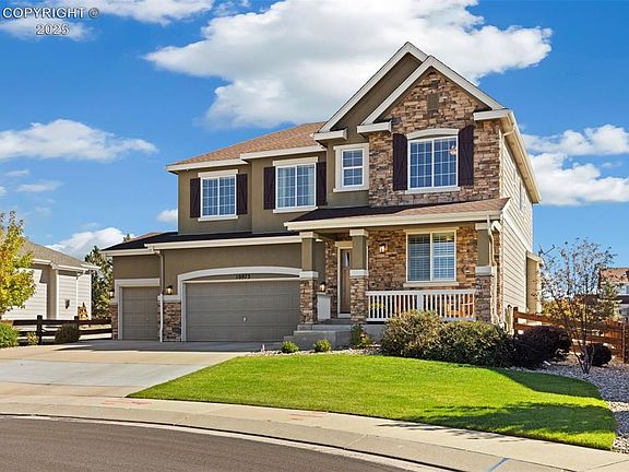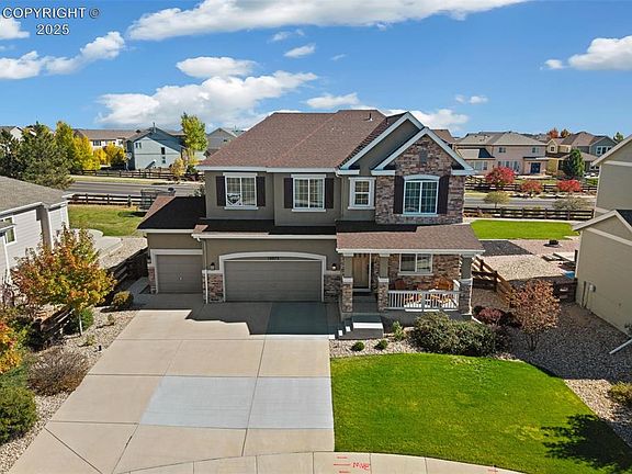 Stunning Richmond Home / 2-story in Meridian Ranch featuring 5 bedrooms, 4 baths, and a 3-car garage with 3,905 sq. ft. of living space, built in 2012 and set on a manicured .21-acre cul-de-sac lot with amazing curb appeal. A beautiful mahogany front door opens to hand-hewn hickory hardwood floors and a custom modern black framed glass-enclosed office, while the open floor plan showcases plantation shutters, a gourmet kitchen with rounded granite counters, a large granite slab island w/ power outlet, knotty pine cabinetry, recipe desk niche, glass block backsplash, stainless appliances, and recessed lighting flowing into the family room with a wrought-iron staircase that leads to upstairs. The master suite offers a coffered ceiling, king-size space, & 5-piece luxury bath, while additional bedrooms capture mountain views, the open upper loft adds flexible living. Baths feature wainscoting and modern neutral tones, and the laundry includes a wash basin with GE washer/dryer. The finished basement boasts a movie room with projector/screen and a slate-tiled bath with sleek, black-framed glass shower. Outdoor living shines with a custom pebble-stone paver patio and lush manicured landscaping. Meridian Ranch residents enjoy golf, pools, fitness, rec center, trails, and parks, plus quick access to Woodmen Road leading directly to the new St. Francis Hospital—renowned for its advanced cardiac care, orthopedic excellence, and specialized women’s health and surgical centers. Nearby shopping, dining, and services provide everyday convenience, yet the community’s layout preserves a rare sense of space, privacy, and neighborhood charm—truly the best of both worlds in Colorado living.