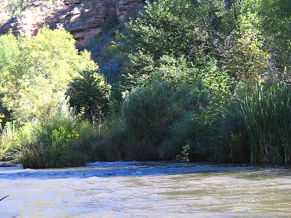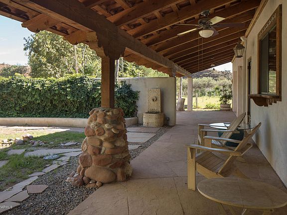 Truly an Oasis with a private, pristine OAK CREEK shoreline. Well thought-out passive solar designed 3 bedroom, 2 bath home, with great room plus entertainment room, all under hand-troweled vaulted ceilings, with oversize 2-car garage+carport. Huge master bath with double shower, Jacuzzi bath, plus outside hot tub. Home is surrounded by large covered flagstone patios and peaceful areas of grass, fountains, stepping stones and mature trees. Beautiful spiral staircase arrives at a tiled Star Deck with panoramic views. Great place for horses and riding, goats, fishing, canoeing, swimming, plus excellent soil for grapes and gardening. From the clerestory windows, thermal mass walls, insulated floors, pastures, to the shores of Oak Creek on a peninsula with an artesian well--RARE FIND!
