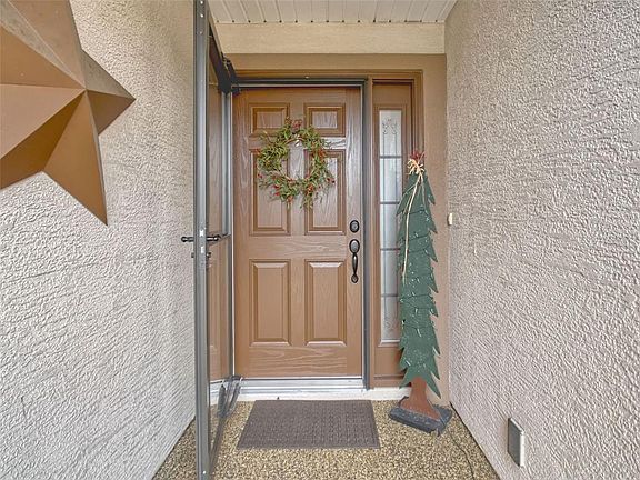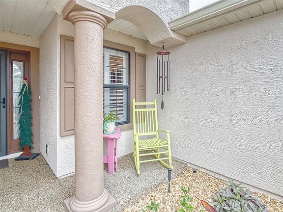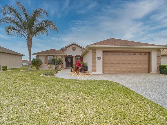 Welcome to the FLORIDA LIFESTYLE in this active gated 55+ community of STONECREST, with golf cart access to shopping and dining. Conveniently located to doctors, services and The Villages. This home has it all, starting with the SOLAR HEATED SALT WATER POOL, with LED lighted screen enclosure with two additional areas for entertaining. The deck and lanai are surfaced in River rock, as well as the driveway and front walk. HVAC system replaced with 14 SEER unit in 2020. Meticulously cared for inside and out. Once you step inside the front door, you will feel at home. There are custom PLANTATION SHUTTERS throughout the home. Vaulted ceilings in the main living area, spacious living/dining room with bar seating at the kitchen counter and an eat in kitchen. There is a double door PANTRY closet and built in desk/workspace with storage. Master Bedroom has a walk-in closet, and master bath has a soaking tub and walk-in shower. Other UPGRADES include EXPANDED LANAI, Custom LANDSCAPE, MOTORIZED garage SCREEN, lanai SUN SHADES and Pull down ATTIC STEPS. Make your appointment today to see this beautiful home before it is gone!