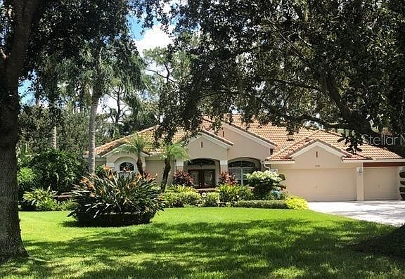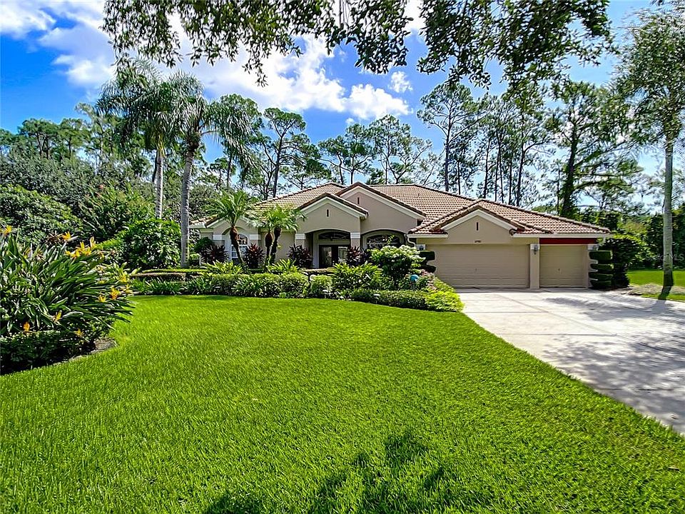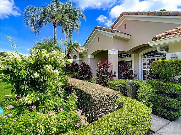 This beautifully maintained 4 bed, 3.5 bath with 3 car garage home has one of the prettiest lots! Located in the gated community of Glenmuir, it's almost a half acre, professionally landscaped, on a cul de sac, and backs up to a preserve to ensure your privacy. There's so much living space! Step inside to a spacious foyer, beautiful hardwood floors, and a view through the living room sliders to the fabulous pool area. The eat in kitchen boasts 42 inch upper cabinets, lots of counter space, granite, an island, newer stainless appliances, wine chiller, pantry, and a breakfast bar. It's open to the family room, and 3 sets of sliders in the eat in area, family room and living room open to the lanai...perfect for entertaining! Off the kitchen, there's a butler's pantry, powder room, and a large laundry room with counter and storage closets. The oversized primary suite offers sliders to the pool area, a huge bath with soaker tub and large shower, double vanity with solid surface countertops, and a closet you could live in! There is a back bedroom with an en suite that's perfect for your guests (or a great mother in law bedroom), and 2 additional bedrooms with a shared bath. The extra room with double doors is perfect for working from home, a gym, library, or a private retreat. You'll want to spend most of your time out on the lanai/pool area adorned with beautiful potted plants - it's a tropical oasis! The pool is salt water, solar heated, has a spa with fountain and waterfall, and a self cleaning system. The sitting area has an outdoor tv and firepit, and both will convey to new owner. There are so many extra features inside and outside this gorgeous house - crown molding throughout, custom paint, wainscoting in foyer and dining area, recessed lighting, custom window treatments, whole house sound system, shed/playhouse, landscape lighting, string lights, paver walkways, new sprinkler pump, gutter leaf guards, and so much more! Put this house on your must see list! Most furnishings are available for separate purchase.