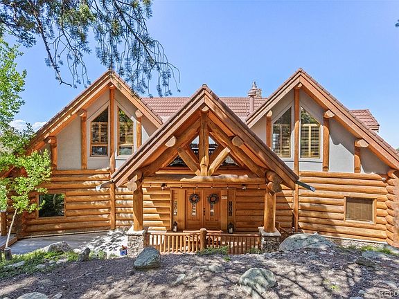 Experience mountain luxury at its finest with this stunning custom log home on 5 acres of a private, gated sanctuary atop Conifer Mountain. County-maintained road to cul-de-sac. Custom built in 2003 & fully renovated inside in 2010. Full-round, hand-hewed logs from British Columbia. Log accented exterior decks & walkways w/ Brazilian ironwood decking. Towering ceilings adorned with custom log beams, stone fireplaces, & expansive picture windows which frame panoramic views of snow-capped peaks by day and city lights by night. Gourmet kitchen boasting exquisite granite counters, custom cabinetry, premium appliances, & a wine fridge, ideal for culinary enthusiasts. The main level primary suite offers a cozy retreat with access to the deck that expands the entire home length. The luxurious primary bath features California closets, a washer and dryer, and a custom zero-entry shower. Bamboo hardwood floors throughout upper two levels. Ton the upper level, you'll find two additional bedrooms, a bath, a loft, and a suspended bridge evoking the sensation of living in a luxurious treehouse. The lower level boasts a fully equipped living space with a fireplace, bedroom, bath, an additional washer and dryer, and a custom library with walk-out access, offering ample room for relaxation and entertainment. Notable features include a 3-story elevator that provides wheelchair accessibility to all levels, custom professional security system with moisture and temperature sensors, and 24/7 remote 8-camera online surveillance system, a whole home generator for added peace of mind. Outside, solar-powered lighting illuminates the landscaped grounds, while a finished heated workshop or storage space and spacious two-car heated garage with Polyaspartic floor system. ****There is elevator access from all three floors.****
