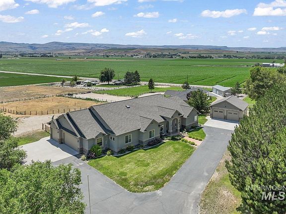 VIEWS and more views! Full wall of windows showcasing an Incredible panorama of the lush landscape in the Sunnyslope wine region. This 2.32ac horse property includes a 28x26 shop with 12' doors, 2 large sheds, 2 fenced pastures, and hay stall with room to expand.. The spacious single level home has two master en-suites, the primary is 24x15' with dual vanities and a soaker tub. The kitchen has full slab granite counters and breakfast bar, hickory cabinets, and opens to an expansive great room. Vaulted ceilings in the entry and living room with beautiful light fixtures and stunning view. Secondary bedrooms are sizeabe with a 4bd/office. Fully finished 3+ car garage with plenty of storage space. Relax or entertain on the 18x24 covered patio on cool summer evenings. Covered RV Parking and plenty of space for toys. Full Irrigation + sprinklers, no HOAs or CC&Rs. Well and septic. Vallivue schools.