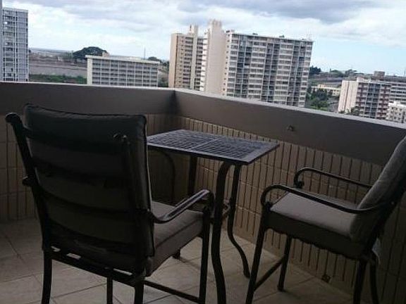 Top floor unit with ocean and city views. Renovated kitchen and bath, with new appliances, bathtub paint, comode, and interior paint. Ceramic tile floors professionally cleaned. Large corner lanai with beautiful views and cool breezes. Quiet side of Salt Lake area, except backs up to Moanalua HS. Can watch the ball games from the hallway. Very convenient to military bases, airport, town and schools. Penthouse unit, must walk up 1 flight of steps to get to it. But, it's worth it!