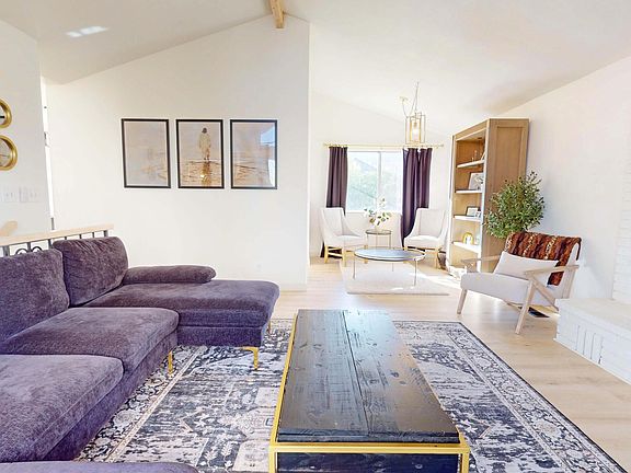 Upstairs features vaulted ceilings with a wood beam, abundant natural light, and a fireplace. The bright kitchen offers quartz countertops, updated appliances, and ample storage, with a formal dining room and deck for entertaining.