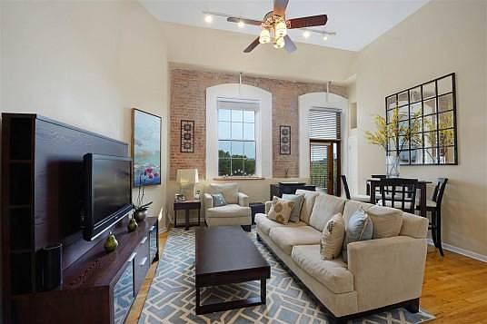 This lofty one bedroom condo in a converted warehouse with garage parking on quiet cobblestone street. Soaring ceilings (over 13' in living room and nearly 12' in the bedroom) and exposed brick add to the historic charm. Spacious living / dining room with large windows and small Juliet balcony showcase both downtown NYC and south and western views. The condo features a renovated kitchen with granite counters, stainless steel appliances, and full height cabinetry. Quiet bedroom, flooded with light. The stylish bathroom has Porcelanosa tiles, April 15 or may 1 move in. one month fee month and half security $50 credit check pay stubs april 15 or may 1