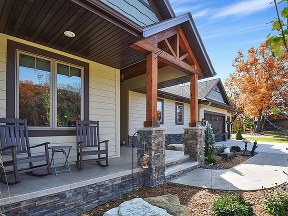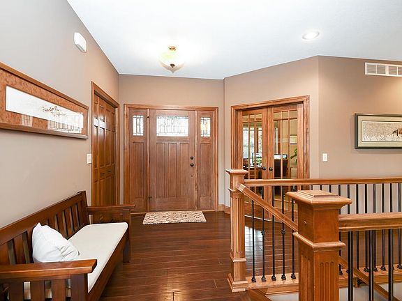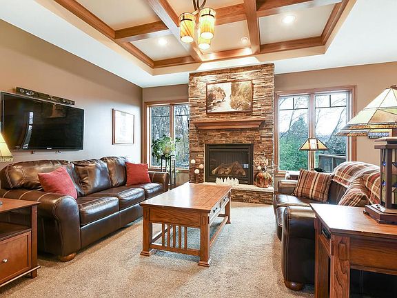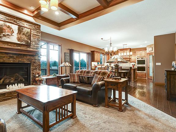 Custom rambler in Shakopee's Stonebrooke development is on a 1-acre cul-de-sac lot and offers one-level living. Open concept main flr features a flr to ceiling stacked stone gas fireplace w/ 10ft coffered ceilings in the living area Chef's kitchen has wood floors, custom cabinetry w/ lg island, granite counters, tile backsplash and under-cabinet lighting. Stainless appliances incl a gas cooktop, double electric convection wall ovens, separate wine fridge and matching stainless farm sink. Master suite incl 4 pc bath w/ heated flrs, jetted tub, separate water closet and WIC. W/O LL family room has custom wet bar w/ dishwasher, icemaker and bev fridge. A media rm, two bdrms, full bath and exercise space complete LL. Backyard stamped patio w/ built-in firepit is at W/O level. Main flr mudroom has custom cabinetry lockers, separate laundry rm w/ folding counter and WIC closet. This home is move-in ready with beautiful upgraded finishes and thoughtful features throughout.