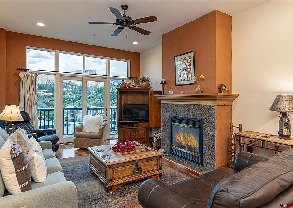 Discover a rare 2-bedroom, 1-bath residence in the coveted Crossroads building, perfectly positioned in the heart of downtown Durango. Being sold FULLY FURNISHED, this turn-key condo is ideal as a desirable private home or as an executive rental ready to generate income from day one. Enjoy two private decks with sweeping views of Perins Peak and the surrounding La Plata mountains beyond. Inside, you’ll find a crisp, modern living space with high ceilings, granite countertops, stainless steel appliances, and Brazilian cherry Karhs wood floors throughout the living, dining, and bedroom areas. The open kitchen showcases a breakfast bar, solid wood cabinetry, a pantry with stackable washer/dryer. Thoughtful details abound, including a gas fireplace with granite surround, enhanced insulation, and acoustical engineering for a peaceful retreat in the center of it all. The shared bathroom is well-appointed between the two bedrooms and central to the rest of the condo. Additional amenities include one assigned underground parking space, a private storage unit which is currently rented out month to month to the Thai Kitchen restaurant, and access to building perks such as a welcoming lobby with front desk and coffee kiosk, conference rooms, and a rooftop deck overlooking historic Main Avenue. This fully furnished, turn-key condo offers low-maintenance living and flexibility—whether as an executive rental or a highly desirable home in the heart of Durango.