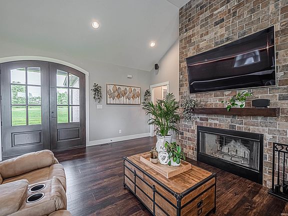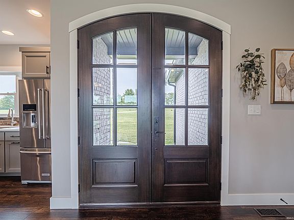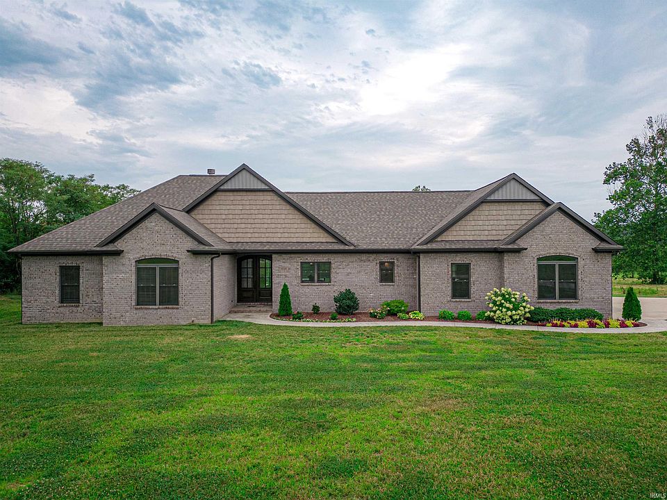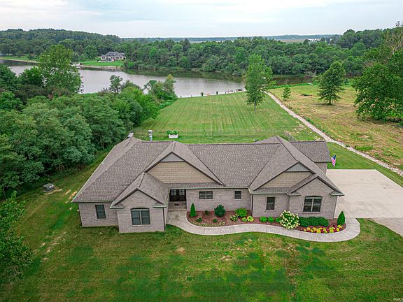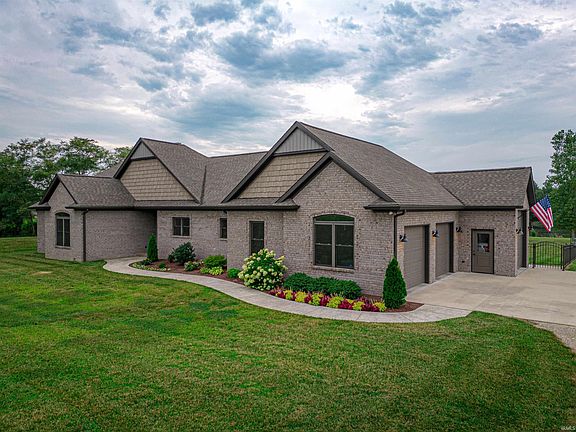 Sunrises, sunsets, and starry nights - this property offers all the allure of country living only minutes from Evansville's bustling east side! On approach to this all-brick, 3 bed/2.5 bath ranch home you'll be struck by the peacefulness that comes with country living as well as the gorgeous landscaping and beautiful double entry doors that set the tone for all this home has to offer. As you enter the great room, you'll immediately be struck by the gorgeous views provided by the huge windows and sliding doors along the back wall. The open concept living room features vaulted ceilings, wood burning fireplace and LVP flooring throughout. The adjacent kitchen is equipped with stainless steel appliances, custom Amish-built cabinetry with soft close, quartz countertops, generous island with veggie sink, eat-in space, and roomy walk-in pantry. Moving into the master suite, you'll discover a large bedroom with tray ceiling, recessed reading lights, lake views, and deck access and a luxurious ensuite featuring jetted tub, water closet, double sink vanity, massive walk-in closet, and large custom tiled, step-in shower. The split bedroom design allows for maximum privacy as the generously-sized additional bedrooms are situated on their own hallway with a conveniently located full bath. Rounding out the home is a half bath, huge laundry room with washer and dryer included, storage cabinets, folding counter, and a fabulous pet washing station! The enormous 3.5 car, side-load garage is equipped with two standard garage doors and a third bay with 10' door ideal for parking the RV, camper, or boat. A mini-split system keeps the garage comfortable year 'round, making it a perfect workshop, hangout, or entertainment space! Moving outside, you'll immediately love the composite deck that stretches across the entirety of the back of the house, providing the perfect space to entertain or relax in the glow of yet another beautiful sunset. A large section of the back yard is fenced to conveniently contain pets or kids or, potentially, a gorgeous swimming pool. Once outside the fence, you'll feel your stress melt away as you wander down toward the edge of the 12-acre lake to listen to the birds sing and watch the fish jump. With too many features to list, this property presents the rare opportunity to own a stunning home in an extraordinary environment!