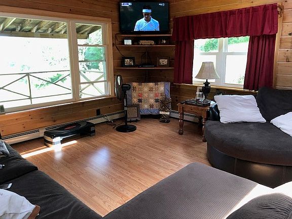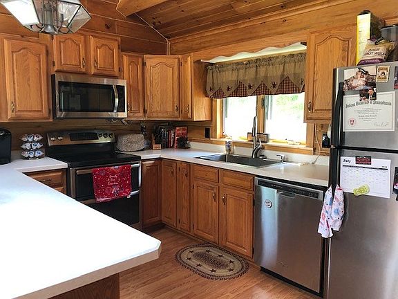 Beautiful log home on 16.43 acres with long views of the Potter County mountains near Shinglehouse, PA. Home features a great room with a timber feature, 3 bedrooms with plenty of room to add more, 2 bathrooms, 2 fireplaces, a lovely sunroom, pantry/shop, storage, den and family room areas in the basement. Owners have installed new windows, floors and hot water tank and heating system for the radiant and hot water BB heat. There are knotty pine walls, a couple of sky lights and the fire places have wood stove inserts. The kitchen has stainless appliances and is open to the dining area and main living room. The land is mostly wooded but plenty of room to till or have live stock. You need to sit on the covered front porch and gaze over the landscape. Stunning views!!