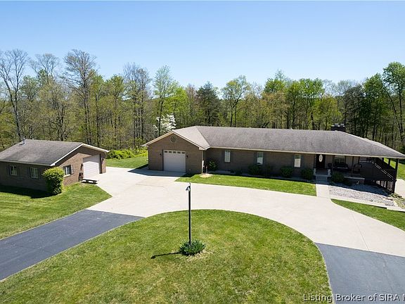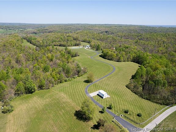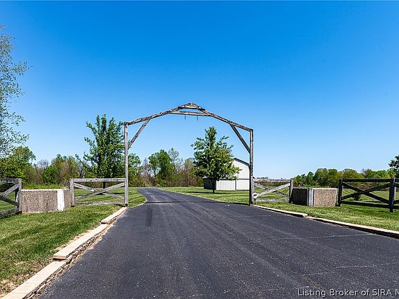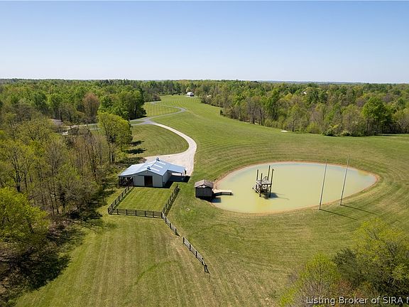 Let your imagination go as wild as the turkey's you will see while sitting on the front porch of your very own 80-acre private retreat in scenic Borden Indiana. No expense was spared on this impeccably maintained and RARE expansive property. This unique and private sanctuary features a beautiful brick ranch home on a finished walk-out basement, a detached garage with workshop area with its own HVAC unit, and a horse barn complete with tack room, horse stalls, chicken coup, and a 3.5 acre fenced-in pasture with a small pond. But hold your horses, because there is so much more. Other features of this one-of-a-kind private estate include a recreational lake complete with dock, swim platform including diving board and rope swing, and a beach area with changing area/deck. As you make your way through the grand entrance onto the property, you will be in complete awe of the rolling hills, fruit trees, and wildlife surrounded by the wooded acreage that makes this a truly private paradise. Other fun features of this property include a hay barn with loft, dedicated playground area, a sand volleyball court, and plenty of extra wooded acres for endless hours of exploring. The possibilities of this property are simply endless and you will easily be able to imagine your potential future dreams of a private family compound, horse ranch, wedding venue, retreat, or your very own campground. Conveniently located 20 minutes from I-65 and only 30 minutes from the bridge to Louisville.
