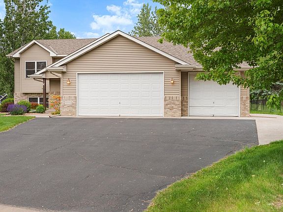This impressive one-owner beautifully maintained 4-bdrm/2-bath home is move-in ready and packed with exceptional features inside and out. The exterior boasts stunning landscaping with concrete edging, mature trees, a concrete parking pad next to the 3-car garage, and a backyard deck with stairs to the yard. Inside, you'll find a spacious entryway and vaulted ceilings that add to the open feel. The kitchen features stainless steel appliances and a large center island, while wood blinds enhance most rooms throughout the home. The finished lower level offers a cozy family room with tongue-and-groove wood accents, built-in surround sound, and a bar area with ample counter space and seating. A fourth bedroom and the second bathroom with tile flooring complete the lower level. Recent updates include a newer washer and dryer, furnace, AC unit, water heater, water softener, and battery backup sump pump. Conveniently located near lakes, schools, library, dining, shopping, golf, and more.