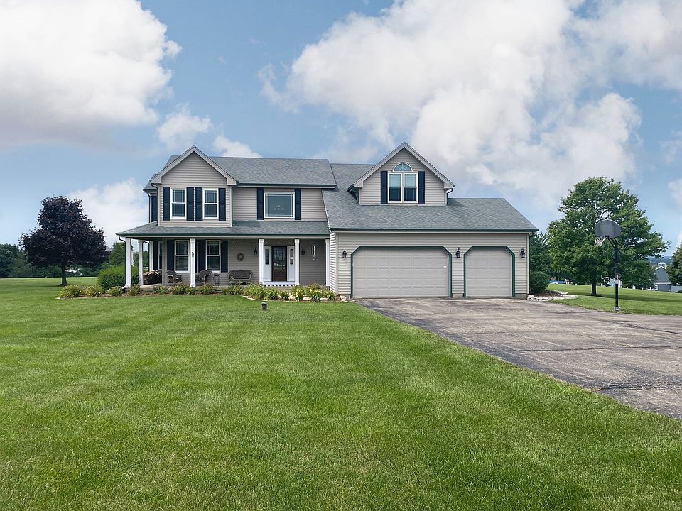 Welcome to your dream home! Nestled on a 2-acre lot with breathtaking views and captivating sunsets, you will step into luxury in this beautifully renovated home; adorned with beautiful hardwood flooring, 6" baseboards, and the attention to detail throughout. The living room is light and bright with door to the wrapped front porch and opens to the dining room! The heart of this home is the stunning kitchen, featuring an abundance of cabinetry, sleek granite countertops, and stainless-steel appliances. A large center island, perfect for entertaining, comfortably seats six and adds a touch of elegance to the space. The family room is a cozy haven, with a charming brick fireplace and a bay window that fills the room with natural light and backyard views. First floor laundry/mudroom. Unwind in the exquisite master suite, which was completely redesigned and brought to life! Not only is there a spacious sitting area with a granite morning bar, a brick fireplace, and large walk-in closet. The bedroom has French doors and vaulted ceilings and the master bath is a true oasis, boasting a large rain shower, a whirlpool tub for ultimate relaxation, and his and hers sinks. Three additional bedrooms provide plenty of space for family or guests. The deep pour basement offers endless possibilities, with rough-in plumbing for a future bath. The three-car garage provides ample storage. Experience the best of country living while being conveniently located close to the middle school and high school. Indulge in all the luxuries this home has to offer and create unforgettable memories in your own private oasis. Newer Windows and Top of the line Whole House Water System!