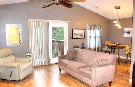 Very nice 2nd floor condo - Quiet! Newer paint, HVAC and Laminate flooring. Vaulted ceilings,skylight, dining area, large owner's suite easily accommodates king sized bed, dresser, night stands and vanity - walk in closet too! Private deck overlooks green lawns and beautiful Alexandria! 1 car attached garage plus separate storage area for luggage, holiday decorations, etc. Very quiet and convenient location - hop on the by-pass or head over the hill to shopping and restaurants on Hwy 54 corridor. Steps away from the greenbelt and Legion park. Impeccable condition - call today to see inside