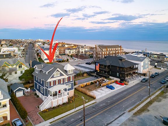 LOCATION, OCEAN VIEWS AND A POOL!! Three story, 6 bedroom, 6 bath beach block home with gorgeous water views was newly built in 2020. This resort-style home features upgraded finishes, hardwood floors throughout, elevator, heated in-ground pool, detached garage/cabana house, ample parking with large paver driveway and huge 2+ car garage under the house. Location is highly coveted, just steps away from the beach and convention hall and within walking distance to shopping and dining. The ground level (with elevator access) is the entire footprint of the home providing plenty of room for both parking and storage. The first level is open concept with the kitchen, living room and dining area. There is also a bedroom and full bathroom. The second level has 4 bedrooms, each with their own private bathroom. One of the bedrooms has custom built in bunk beds, perfect for the kids and grandkids. The laundry room is also located on the second floor. The private master bedroom is located on the third floor and features a walk-in closet, master bath with his and hers vanities, sitting alcove and a separate sitting room with gas fireplace. This home has it all when it comes to outside living. There is a beautiful front porch, back decks on each level and of course the heated pool with cabana house. There are phenomenal ocean views from the second and third floor. Would be a perfect second home and if you are looking for an investment property, look no further. Excellent rental history. This property grossed $221,000 in 2022 and is always booked solid. This home is being offered fully furnished and turnkey.
