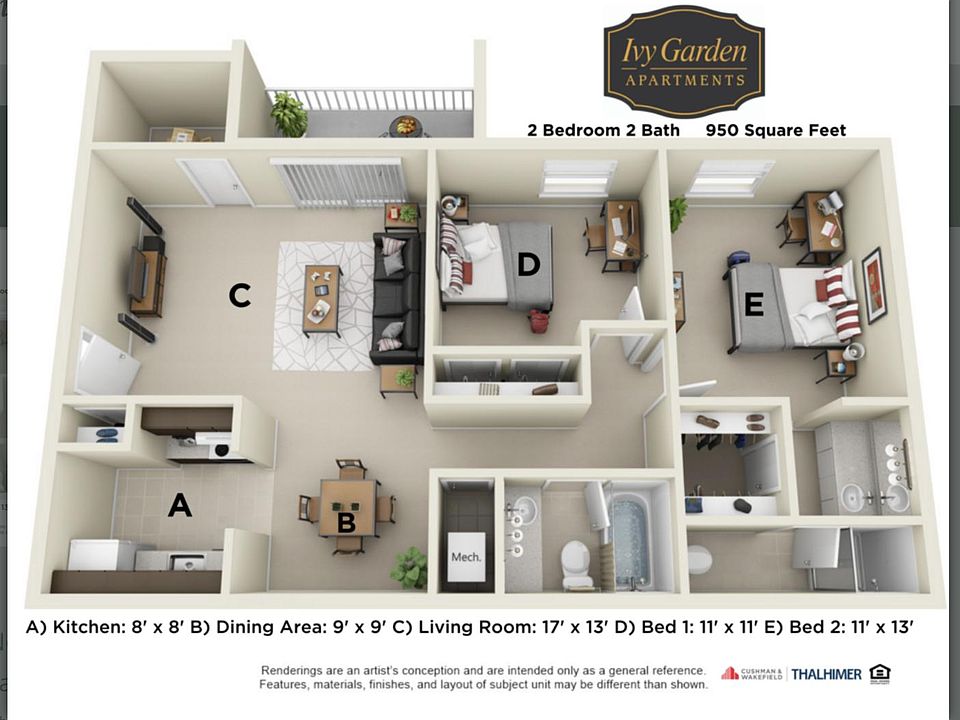 - Total interior livable area: 950 sqft