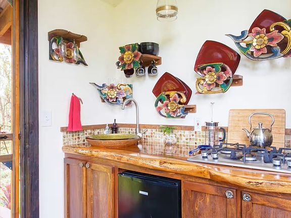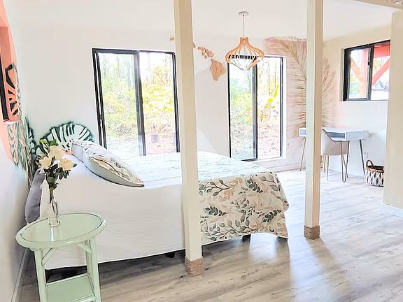 Adventure treehouse, bird watching deck, and zooming zipline... as featured on HGTV! Our Tiny Tropical Treehouse is a very special space full of creativity and beauty. Custom built by an artist, this eco-house is flooded with natural sunlight, rich with wood accents, murals, and inextricably connected to nature. It is ideal for couples and individuals looking for a private retreat nestled away in the jungle. Adventurers, relaxers, writers, and artists will enjoy staying here, a mere 18 mi from all Volcano National Park has to offer and 20 mi from downtown Hilo. Have you ever wondered what it would be like to live off-grid in a treehouse surrounded by the Hawaiian jungle? This rental is one of a kind. The house boasts an eco-friendly footprint to travelers, budding botanical garden, unique custom interior, jungle murals, and a getaway retreat from busy life. With high speed internet you can even work from home or stream at your leisure. Follow the red cinder trail through the stunning botanical array that envelops our off-grid tiny house. Ascend 8 feet up into the air for the cool breeze and a better view of the surrounding flora and fauna. You've arrived! With a total of 17 windows and glass doors, you enter into the comfort and luxury of the home but your view extend hundreds of feet into the surrounding jungle of Ohia and Hapu'u. Once inside you will see dozens of wood accents, from our high-backed log chair, to our Koa Wood Balinese style couch. The loft is held up with posts made from Ohia trees sourced from our own property. We made the loft handrail, coffee table, and hand-towel hangers from trees that had to be cleared during the construction of our house. Enjoy lounging on the expansive Balinese couch while you bird watch, or kick your feet up onto the trunk as you become immersed in a good read. On your way to the kitchen meander past the stained glass window depicting a cardinal, we coincidentally have two males and one female on the property! Also keep an ear out for baby hawk in the early spring. You enter the kitchen and will be blown away by the design of the floating dish racks. The custom Chocolate Albezia wood slab counter top shimmers, as does the glass sink basin and hand blown pendant lights hanging overhead. Relax at the kitchen bar and sip on your morning coffee as you watch the sunrise strike leaves and dew, setting them off into stunning shades of green, red, orange, and yellow. Eat your lunch while pondering the tiny mushrooms and vibrant moss growing on a nearby tree. Drink a glass of wine while you stare at the milky way and the moon. Tucked away in a dark corner of the house is the lava themed bathroom. Enter the bathroom and feel the cool natural stone underneath your feet, be reminded of that lava tube you explored yesterday or will crawl around in today. The main volcanic mural, created with naturally smoothed lava rocks, will captivate your eyes as you shower. The fiery glass sink, with a rough field of lava swirling around it, is a focal point of the lava spilling into your lavatory experience. A local female artist made the themed art piece hanging on the wall; illustrating traditional canoes, hula, Pele (the volcano goddess) and ancient rituals. The sliding barn door and tinted openable window envelop you in the private surreal feel of the space. Enjoy! It's all yours! The treehouse! Supported by two rows of sister trees, the deck is a magical place to lay down and look up at the sun shining through the leaves, get close to Lehua blossoms or a herd of blooming orchids, and watch the stars glittering through the branches. We enjoy eating every meal we can out there and doing work while lounging up in the air. When all the excitement has passed and you're all tuckered out, climb the space efficient right-left ladder staircase to the loft. Wiggle into the comfort and luxury of our memory foam mattress, feel it envelop your body, and then never get up ;). The loft is cozy, but it's a room with a view. Along the headboard a 10 inch window encourages you to stargaze from the comfort of your bed, at one of the clearest skies in the world! I personally love laying staring out the openable window and looking at the silhouettes of the surrounding forest contrasted against the starry night sky. Under the warmth of the comforter enjoy the cool mountain breeze (1900 feet of elevation) as you drift off to sleep. What else can we say? This place is paradise and heaven on earth and our pride and joy. We hope you will love it as much as we do! We hope you remember the beauty of this place & bit of land long after you are gone, to us, "eco" can also mean luxurious! 1-12 months lease available, utilities included, no smoking on or near property, free parking on site, tenant cleaning checklist required for deposit refund.