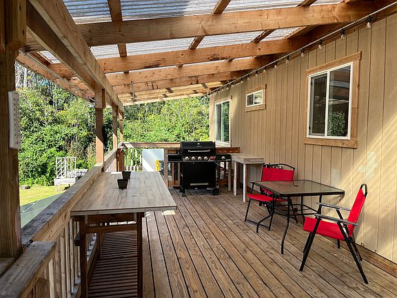 Dream of living off grid in Hawaii with Solar Panels, Batteries and your own 10,000 gallon brand new water catchment and propane on demand hot water on 3 beautiful acres. Fully Furnished and Move In Ready 2 BR/1 BA Home on Post & Pier. Home has been lovingly renovated with a beautiful new custom kitchen including custom made wood cabinets, new bathroom and new flooring throughout. The primary suite has an attached bathroom and walk in closet. Gorgeous covered spacious lanai for indoor/outdoor living.