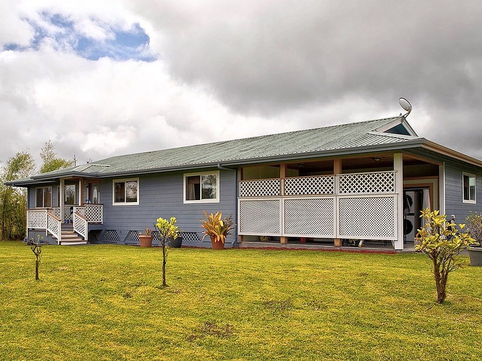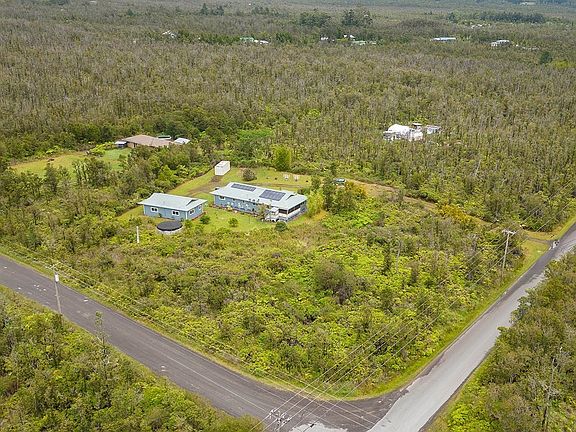 Fabulous location in Fern Forest Vacation Estates on corner 3 acre 348ft X 375ft lot on paved Ala Kapena Rd. Most lots in Fern Forest are spaghetti lots which are very narrow & long. This one is a more of a square making it very desirable & private. Enter the property through a lovely aluminum solar powered gate w/key pad & remote entry. Wind up the driveway to a well maintained 3BR/2BA home offering 1846 sqft. of living space. An additional large bonus room with half bath with new sink & fixtures in the detached 1 car garage could be used as an office space or guest suite. In addition to the garage there is a carport attached to the house providing more covered parking. LG stackable washer & dryer are a year old & are located in the carport. Both house & garage Hardiplank exteriors have been freshly painted with high end mold resistant paint. Seller has recently updated most fixtures both inside & out including new ceiling fans, light fixtures, smoke detectors & more. Enjoy the large kitchen with newer stainless steel dishwasher, refrigerator & brand new stainless range with microwave hood. Beautiful custom cabinets with high-end hardware including pullouts, soft close drawers & nice sized pantry. Large dining area off the kitchen leads to covered screened in lanai for outdoor entertaining. Great room has plenty of space for your sectional couch, giant flat screen TV & more. Master bedroom is spacious w/two closets, an en suite bathroom with large walk in shower. Two additional bedrooms are also spacious & share the second bathroom. Windows are double paned vinyl. 10,000 gallon catchment tank replaced in 2016 and filtration system udated in 2023 w/three sediment filters & UV light filter. Sunrun Solar lease transfers to new owners offering low utility bill. APN Security system, 3 security cameras & motion detector lights installed. Above ground pool stays with property! Variety of fruit trees and chicken coop. Minutes from Volcano Village and close to Hilo too!