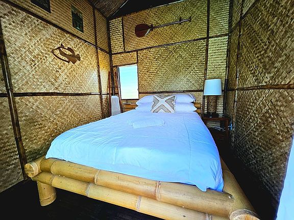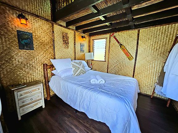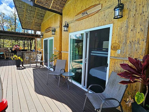 There are three meticulously crafted poolside cabins, each adorned with bamboo siding and distinctive Hawaiian decor. Currently, these cabins are set up to sleep as many as 10 people. A fourth, larger “owners cabin” sits just off the large Trex deck and has its own private covered area.