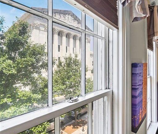 Fantastic Jr one bedroom with stunning views of Supreme Court and Library of Congress from the living room and sleeping area. Tall ceilings, well kept wood floors, very nice. Queen size bed in sleeping nook and queen size pullout sofa in living area. Gorgeous kitchen.