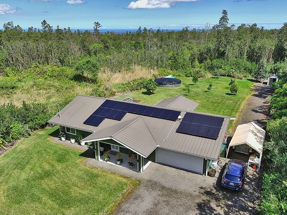 Currently accepting backup offers. Private setting in Mountain View, Hawaii. Lovely spacious four bedroom two bath single story 1,500 square foot home on two acres of land. Surround yourself in peaceful woods, and live comfortably here in your newer home built in 2019 on the Big Island. One of the best features of this lovely place in paradise is the ultimate off grid PV system. The solar system has 24 panels owned outright, Outback Radian inverter rated at 8000 watts, 2 Outback FlexMax 80 amp Charge Controllers. Battery is brand new Home Grid powered by Lithion. Honda EU7000is back up generator is wired to solar system, it's estimated the seller spent approximately $50,000 on this system! Gated front entrance, monitored by Vivint video and security system, with LED exterior lighting and motion detectors. Home was built in 2019 and features Smart paneling exterior siding. Beautiful tongue and groove pine cathedral ceilings in the great room. Modern kitchen featuring custom recessed ceiling and under cabinet lighting, lava granite countertops, gas stove, and stainless steel Samsung appliances including a dishwasher. Split floor plan with 3 bedrooms, 2 baths on one side of the house, and the 4th bedroom and 418 square foot two car garage on the other wing of the house. There's plenty of room to expand, since roughly only a half acre of the total two acres has currently been developed, imagine the possibilities. The seller has already planted on the property two avocado & coffee trees, navel orange, Calamondin & Tahitian lime, Meyer lemon, tangerine, breadfruit, mamaki, & clove. There's even two raised garden beds in the back yard, and a start of a herb garden in the front yard with rosemary, oregano, and lavender. Live here in Fern Acres subdivision, for more information about the subdivision please visit http://fernacres.org/