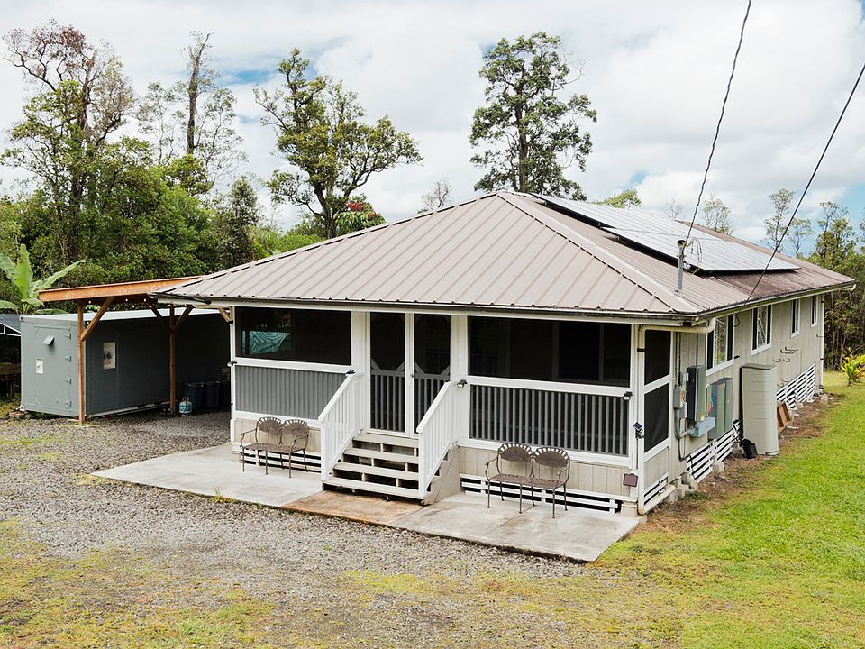 The welcoming front porch is a great place to greet guests as well as a comfortable outdoor space for relaxing or entertaining. A large, open layout between living room, dining area, and kitchen features vaulted ceilings, and large windows, allowing lots of natural light and ventilation. Conveniently located off the main living area is a room that is currently being used as a pantry, but could be a home office or storage room. Additional storage is also available in the attic crawl space. An enclosed laundry room with a utility sink is located just off the kitchen. <br><br>Under current ownership, the home has received some exciting upgrades:<br>- New owned (not leased) 20-panel photovoltaic system with two large batteries for energy storage<br>- New water pump, pressure tank, and water filtration system, including an ultraviolet (UV) light filter<br>- New Rinnai tankless gas on-demand hot water heater<br>- Beautifully-renovated en-suite bathroom off the main bedroom<br>- Large new carport for covered parking or more space for entertaining<br>- Fresh paint inside and out<br><br>Tucked back from the main road down a long, S-shaped driveway for your privacy, you are surrounded by native forest, with large, old growth 'ohia trees. At an elevation of around 1,400 feet above sea level you will appreciate cooler weather and still be able to plant a garden and grow your own food. Currently established are ornamental plantings of ginger, ti leaf, and crown flower, and crop plantings of citrus, banana/plantain, and pineapple - among others. Fern Acres subdivision offers private paved roads and close proximity to Volcano, Keaau, and Hilo for all your amenities and adventures.
