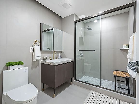 The primary bedroom has a large reach-in closet, its own private balcony, and an immaculate en-suite bathroom with a custom vanity with storage and mirror, as well as a glass-enclosed walk-in shower with oversized rainforest shower. The second and third bedrooms have large built-in closets and sit across from a second full bathroom.