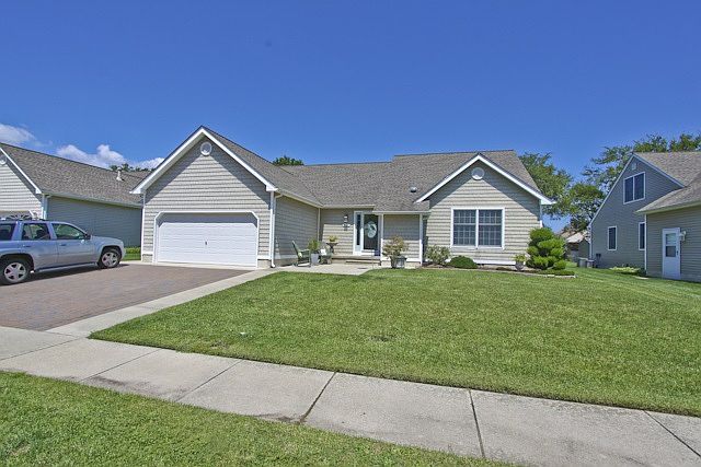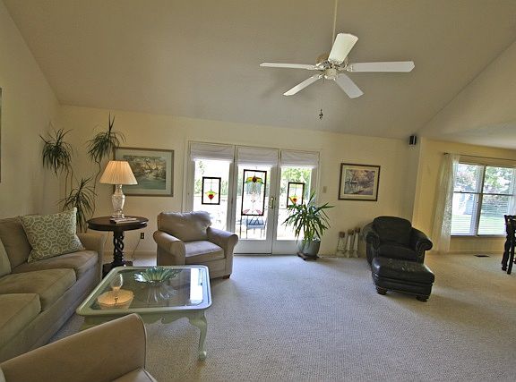 Completed in 2003 by Bowman Builders, this Tranquility Park home offers many amenities. The tiled foyer and hallway lead to the open floor plan with vaulted ceilings in the great room. The kitchen features oak cabinets and a breakfast bar. The Master Suite has a tiled bathroom, step in shower, double vanity sinks and a walk in closet. The two guest bedrooms have wall to wall carpet and ceiling fans. The Brentwood I layout includes finished stairway leading to the second floor, with potential for two bedrooms and rough plumbing for an additional bathroom. The laundry room has washer, dryer and a utility sink, this room also accesses the attached two car garage. Outside side entry to garage has concrete walkway that leads to the enclosed outside shower. There is an additional concrete patio in back yard and the parking area has stone pavers.