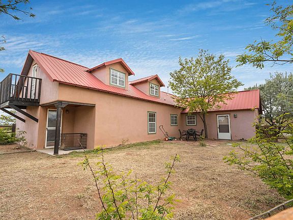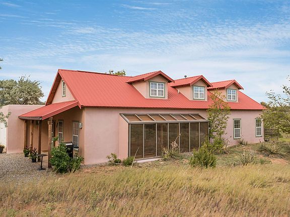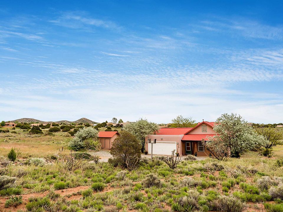 Absolutely endearing in Eldorado! One of the few Northern New Mexico pitched roof houses constructed in the subdivision, this virtual 'dollhouse' further benefits from a gorgeous and peaceful greenbelt setting. Located within a mile of Eldorado Elementary / Middle School as well as walking trails and less than two miles to the Agora Shopping Center and the Community Center / pool / dog park. High dormer windows over the great room cathedral ceilings allow plenty of ambient light, while the sunspace with its bank of windows gives panoramic vistas of distant mountains, and showers the dining room and kitchen with natural light. Tongue-and-groove pine ceiling in the living-dining "great room" and kitchen, plus beautiful wood beams and corbels give the house a beautiful southwestern feel. The downstairs includes the living, dining, kitchen, two bedrooms and a full bath. A playful spiral staircase leads up to the loft with a spacious third bedroom or office plus a full bath. The loft also enjoys a 'Romeo and Juliet-esque' balcony with mountain and plains views to the east, south and west. Solar panels on the roof ensure you will never pay another electric bill, and a shady patio off the laundry room gives you sheltered outdoor space for dining and barbecuing.