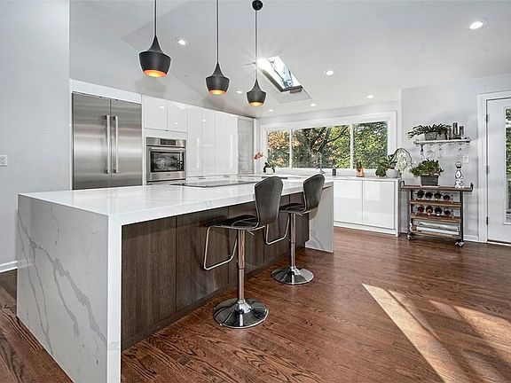 Nestled at the end of a quiet cul-de-sac, this home has been totally renovated with taste, aesthetic design, and function in mind. Light and airy, the open concept of kitchen, dining area and living room is perfectly integrated into one of the main centers of activity of the family. The large double thick island stands out with dramatic effect as oversize windows, high ceilings and skylights bathe the space with natural light. French doors lead to the spacious upper deck overlooking the backyard for alfresco dining or casual barbecues. The kitchen is equipped with custom-built tall cabinets and the latest stainless steel Bosch appliances. This floor has 3 bedrooms: master with custom-built walk-in closets and ensuite bathroom with rain shower, steam bath, and sound system. 2 other bedrooms with full hall bathroom & bathtub complete that floor. The lower level features a 4th bedroom with its own ensuite full bathroom. In addition, a large family room with wood burning fireplace and an optional full-size screen and projector. A home office space can be easily integrated in that space. A gym/playroom leads to a charming outside patio and down a few steps to the enclosed backyard with a full swing set. Further down the corridor, there are closets including a functional washer and dryer room. Location, location! Near tennis courts, parks, playgrounds, country clubs, golf, schools, shopping. Easy access to main roads - Youre a 7 min drive to Larchmont train station and 11 mins to New Rochelle train station; Manhattan is a 35 min ride away. This is more than a house - It's a home. Make it yours! Renter responsible for snow removal, water charges and landscaping maintenance. Additional Information: HeatingFuel:Oil Above Ground,ParkingFeatures:2 Car Attached,Storage: Garage, Play set, light fixtures, window treatments, exercise equipment stay. Also , landlords are using half the 2 car garage and adjoining closet for their personal effects.