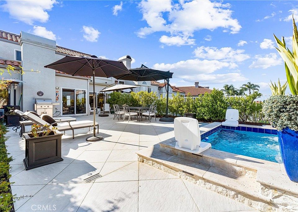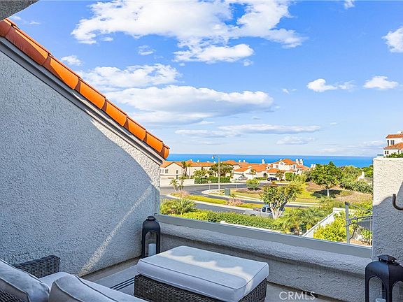 Discover refined luxury in this custom-upgraded home in the prestigious, guard-gated community of Laguna Sur. This rare gem boasts a large back yard, the most popular floorplan, and breathtaking panoramic views of the ocean and Catalina Island. Prepare to be dazzled by every aspect of this gorgeous home, from the inviting front courtyard with tiled paving and six-panel double front doors, to the sun drenched main floor boasting rich marble flooring, a chef's kitchen featuring white European cabinets, granite countertops, and top-of-the-line built-in appliances. You may never want to leave the stunning custom-designed backyard with a magnificent water feature that doubles as a small swimming pool, perfect for entertaining. Elegant touches include Hunter Douglas remote blinds, California shutters, and custom crown moldings. Upstairs, the luxurious master suite offers a built-in bed wall with beveled mirrors, a padded headboard, custom nightstands, and a new master closet with full mirrors and shelving. Two additional spacious bedrooms flank the guest bathroom, featuring a frameless shower and marble floors. An upstairs nook has been transformed into a custom-fitted office/study, and the private balcony provides the best views in Laguna Sur.